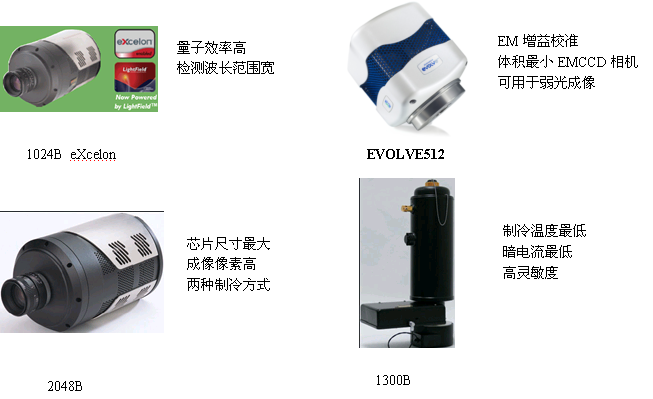 Lumazone FM系统允许使用者从几款不同的背照式CCD 或EMCCD相机中选择一款。或者,也可以选择一款前照式EMCCD相机(型号1002FE)。