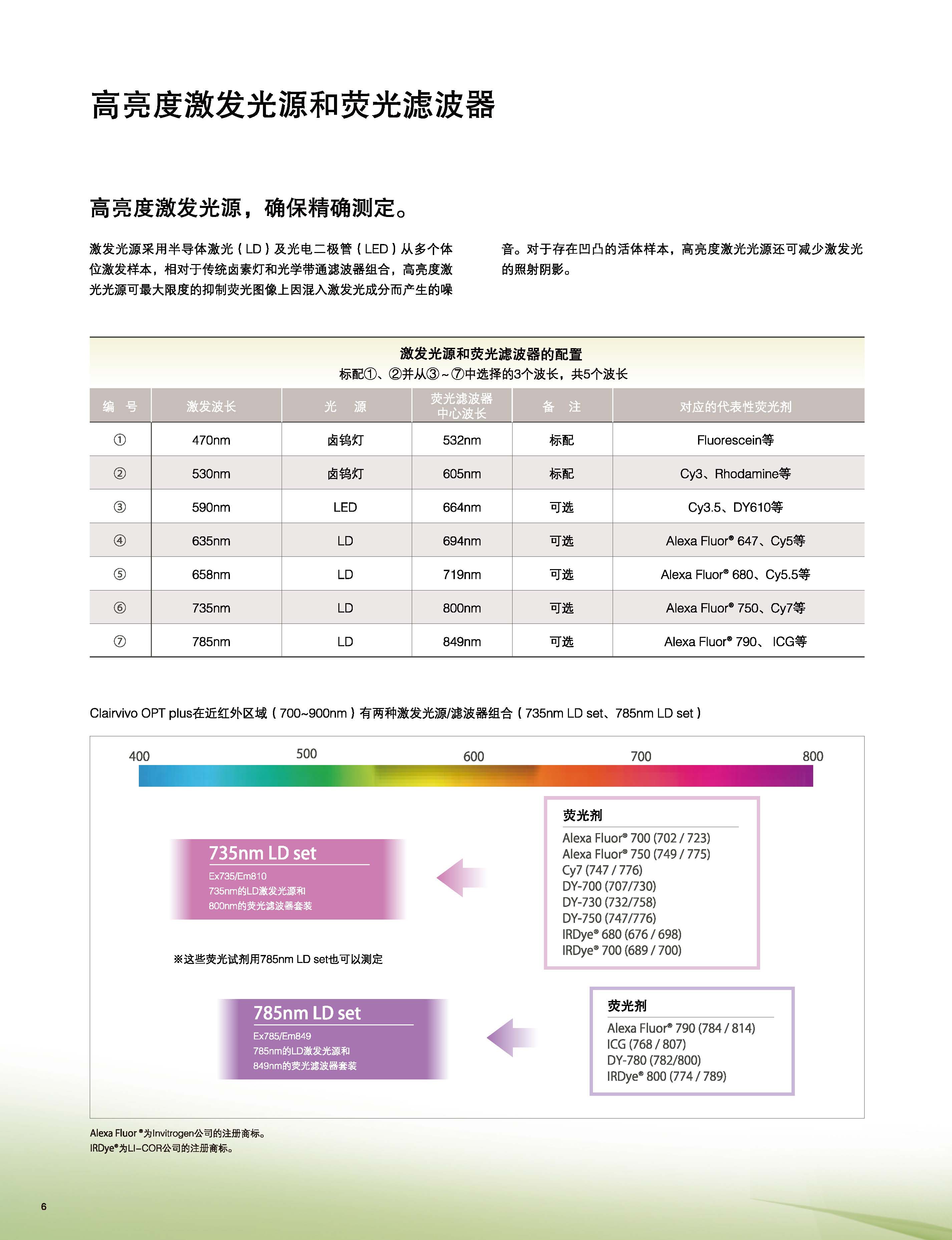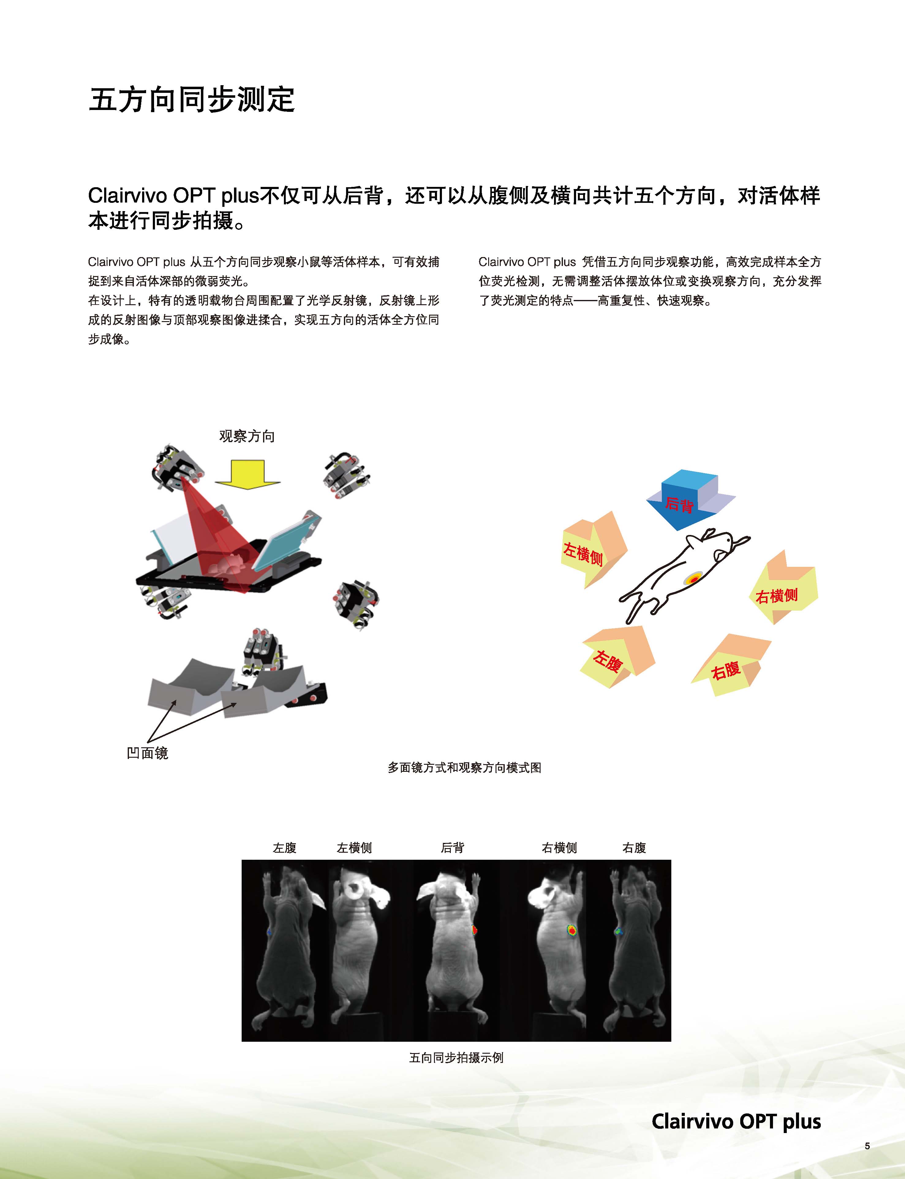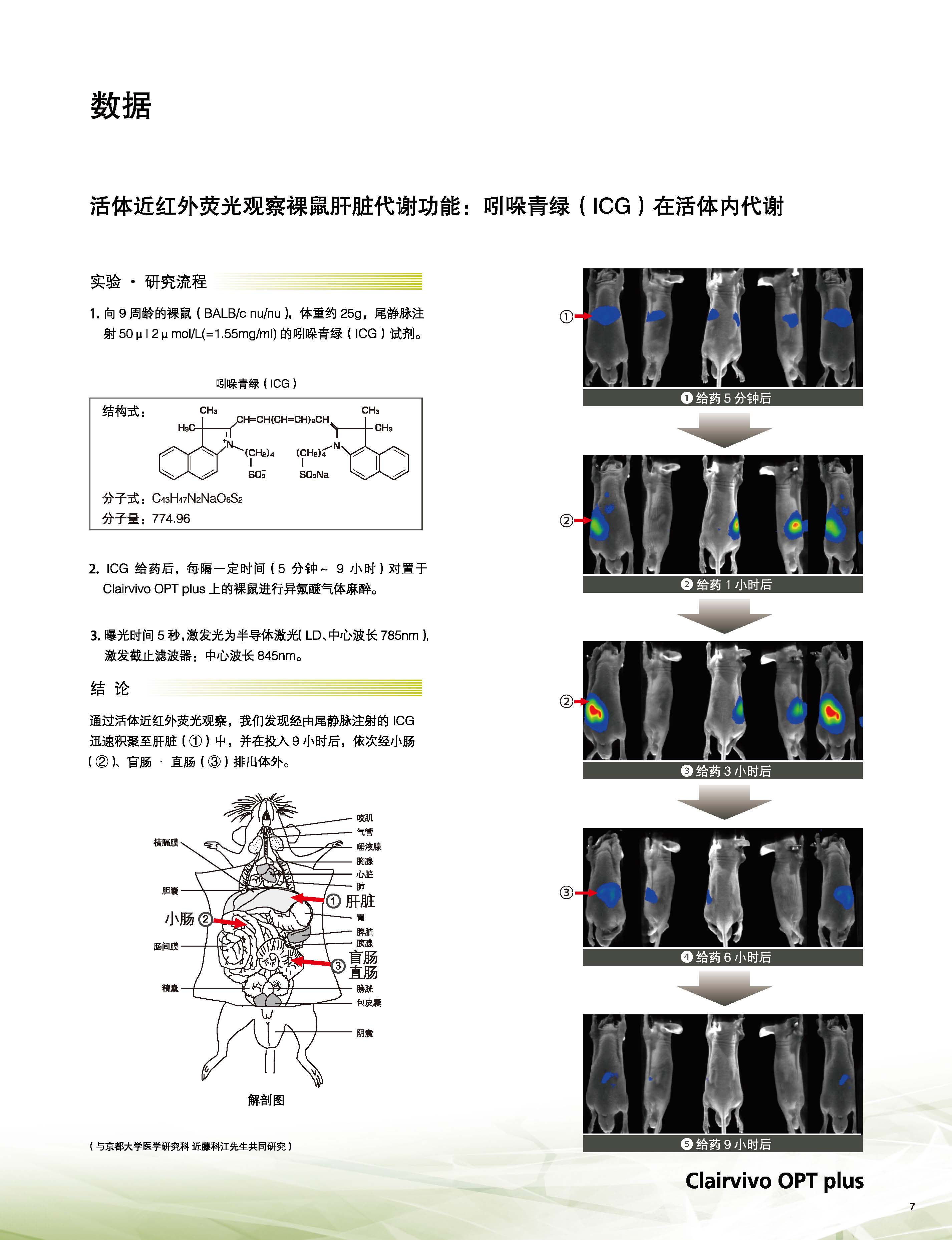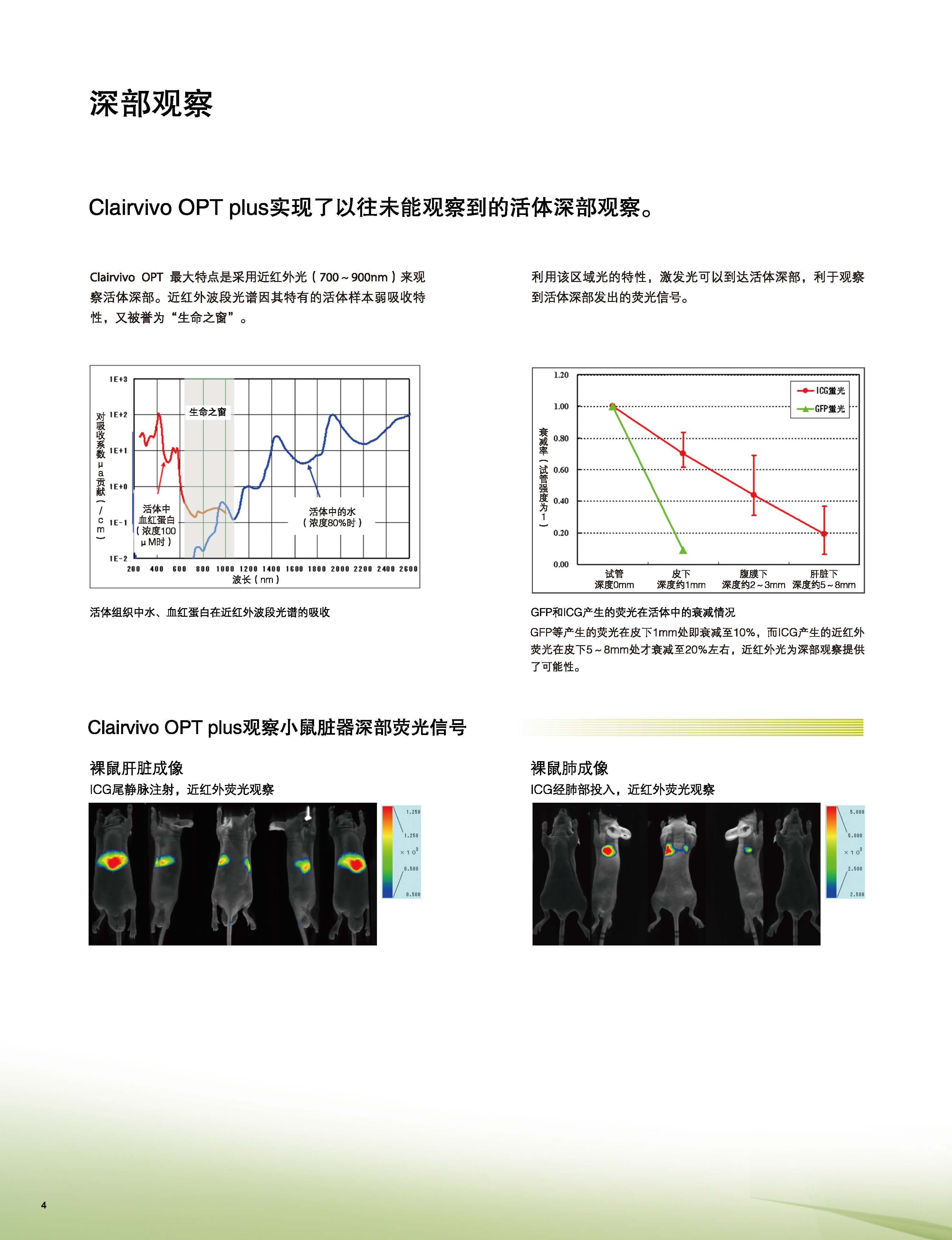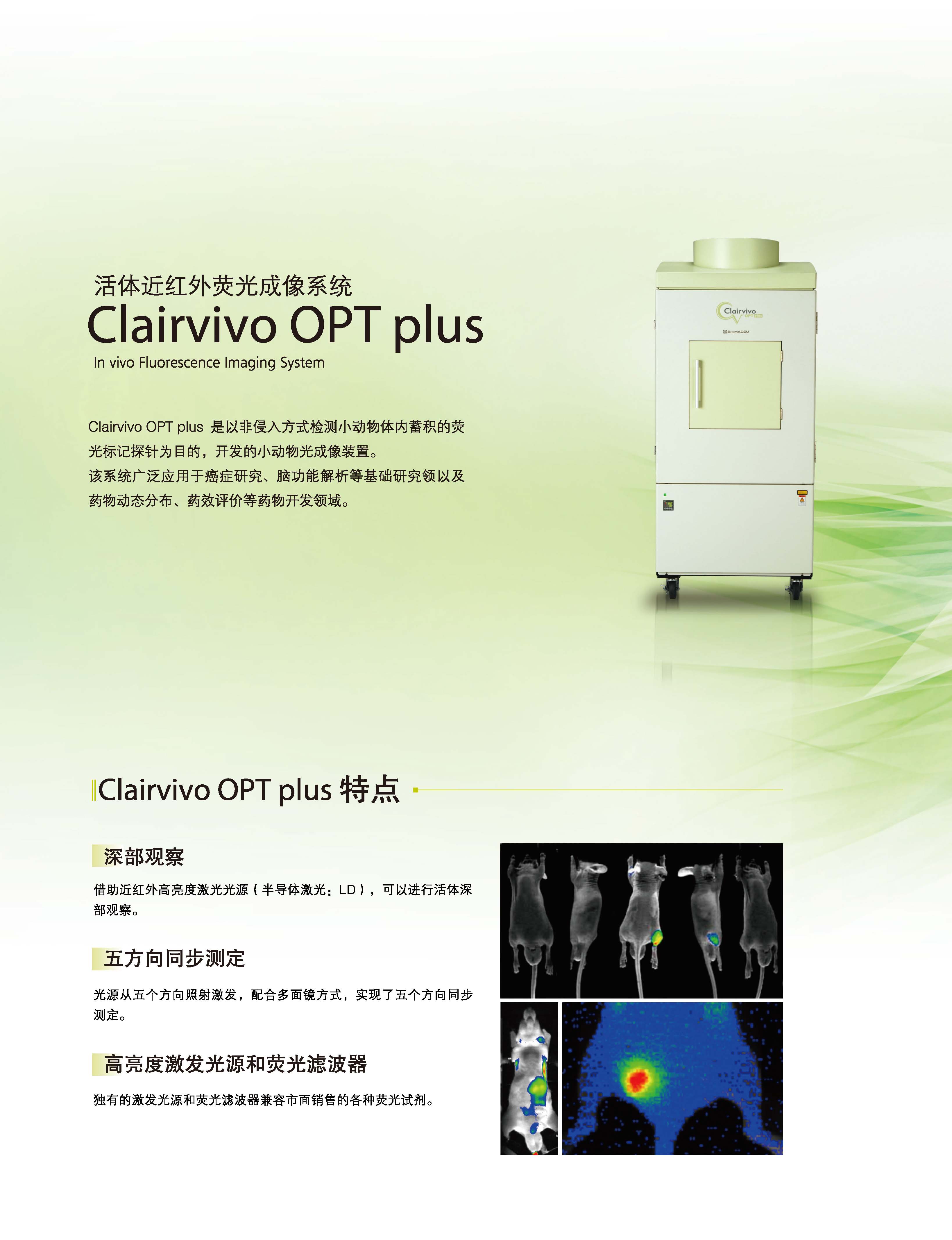 Clairvivo OPT plus是使用小动物体内标记的荧光探针进行光学成像,广泛应用于癌症研究、脑功能解析等基础研究领域以及药物动态分布、药效评价等药物开发领域。该设备拥有2D成像产品中深层发光最好的技术:使用激光做激发光;可以清晰得到肺部、肝脏、肾脏位置的图像。特别适合做biomarker的研究。也可以进行生物发光成像。