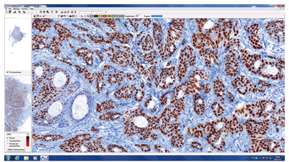 本软件可自动评估免疫组化细胞核染色(ER、PR和Ki-67等)的数字切片样本,采用色彩去卷积算法,用染色强度训练软件,采用ALLRED评分法,自动将细胞核分成阴性、弱阳性、中阳性和强阳性等级别。