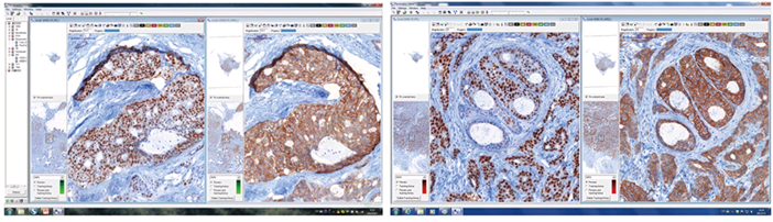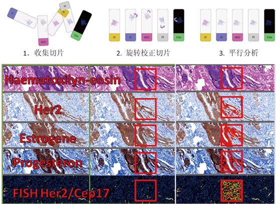 提供类似于肿瘤委员会的切片分析管理功能,适用于在同一组织块的连续切片上进行不同染色(HE/IHC/FL)后,进行不同蛋白表达的比较。可以进行切片旋转和校正,按照预设在多张切片上同时进行操作,获得更加客观可靠的结果。