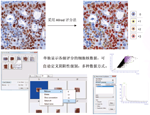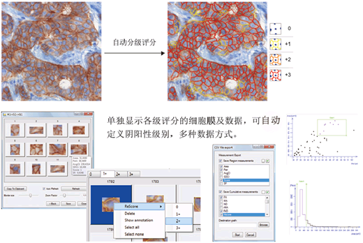 本软件可自动评估免疫组化细胞膜染色(HER-2和EGFR等)的数字切片样本,采用色彩去卷积算法,用染色强度训练软件,采用ALLRED评分法,自动将细胞核分成阴性、弱阳性、中阳性和强阳性等级别。