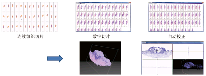 对同一组织块连续切片数字化后,利用三维组织重建技术,还原三维组织结构。自动对齐或手动调整非重叠连续切片,可从任意角度对3D对象的重新切割,研究各层间细胞结构的变化,可在三维结构中进行细胞计数机长度面积等的测量。