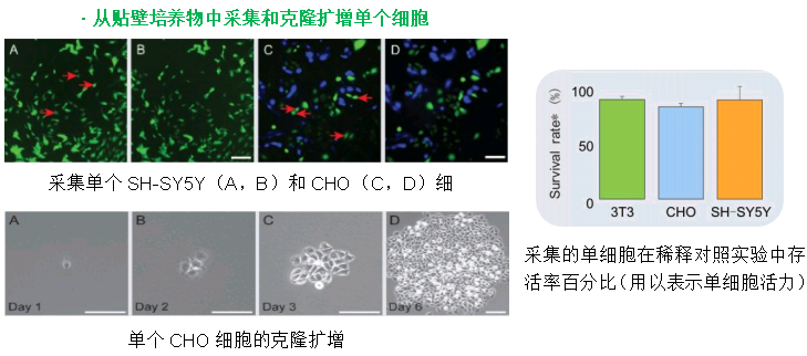 2. 在显微镜下对组织切片的目标区域进行有效切割,或从标准细胞培养板、培养皿中生长的任何贴壁培养物中收集和沉积单个细胞,体积小至15 nl。