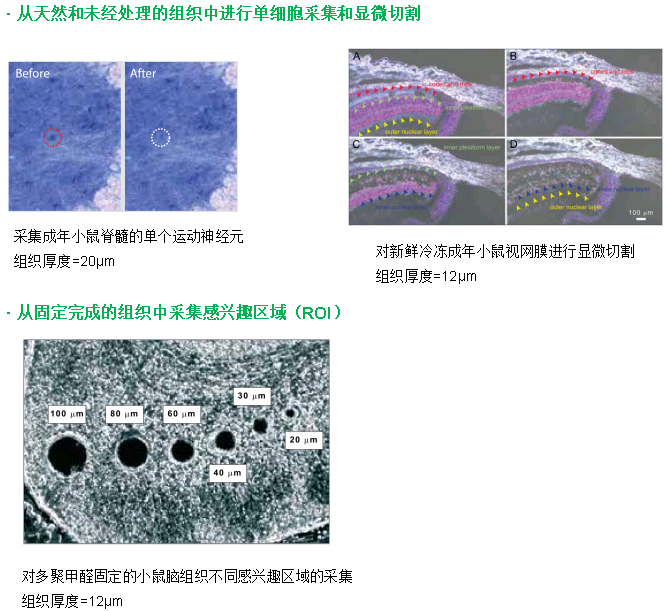 ·直径范围10-100μm,使用范围从单细胞采集、培养细胞克隆采集、到特定组织区域的显微切割。